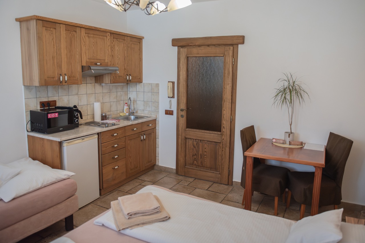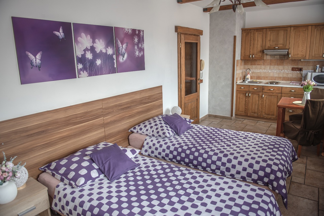 Dvoulůžkový pokoj -- oddělené či manželské postele jsou vybaveny vysoce kvalitními matracemi a lůžkovinami. Koupelna se sprchovým koutem a WC, TV, přípojka na Internet - Wi-fi a vybavená kuchyňka s lednicí a vařičem.