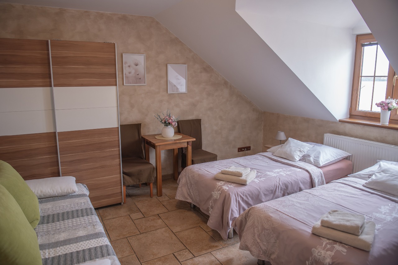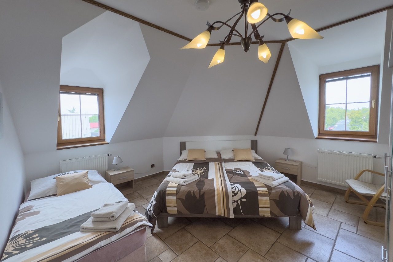 Třílůžkový pokoj -- oddělené či manželské postele jsou vybaveny vysoce kvalitními matracemi a lůžkovinami. Koupelna se sprchovým koutem a WC, TV, přípojka na Internet - Wi-fi, lednice, rychlovarná konvice.