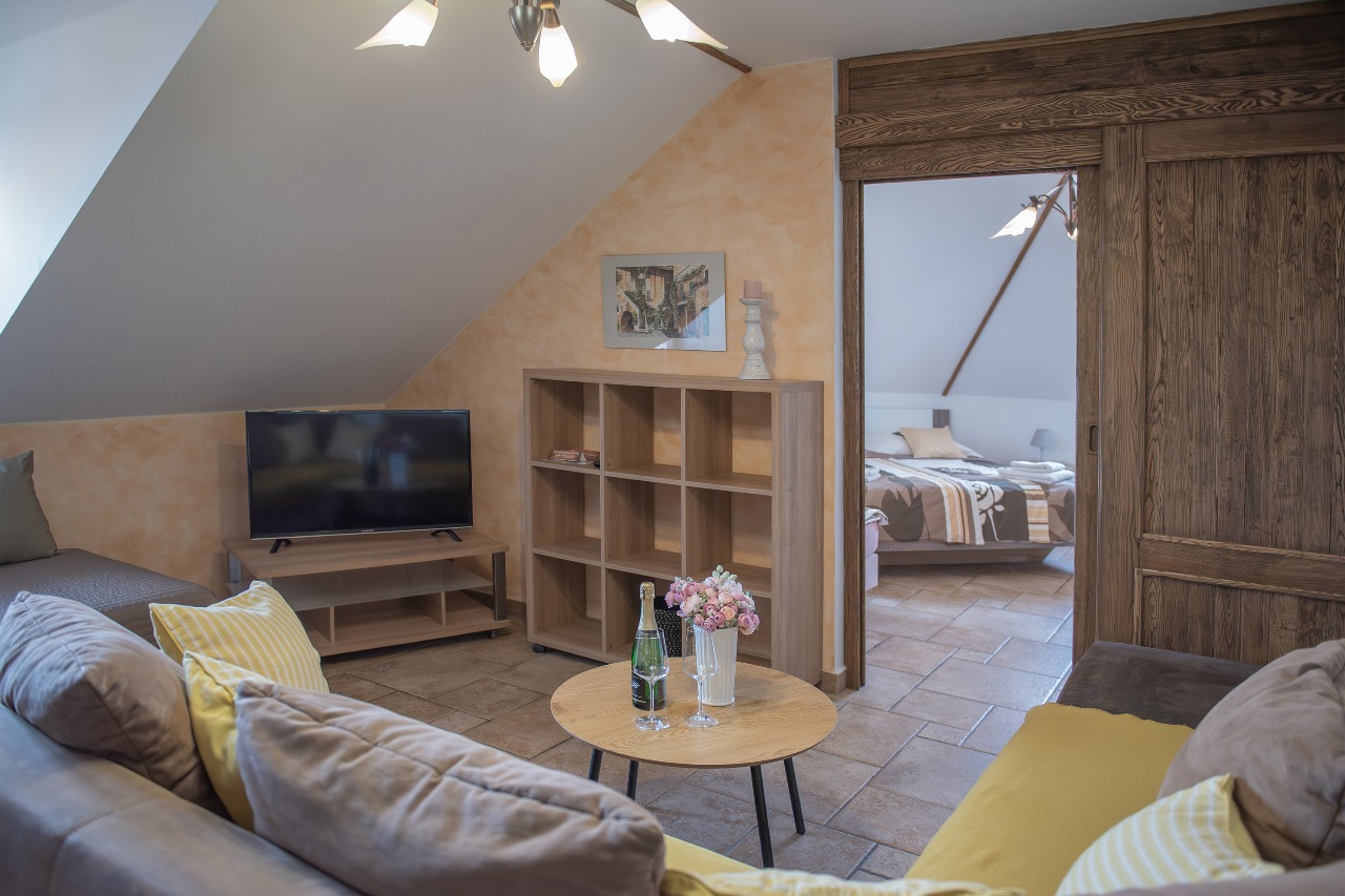 Apartmá se skládá ze dvou propojených pokojů s jídelním koutem, kuchyně vybavené lednicí, sporákem, troubou, mikrovlnnou troubou a myčkou na nádobí. Pokoj je vybaven manželským dvoulůžkem, dále je zde rozkládací postel, televize, přípojka na Internet - Wi-fi. Koupelna se sprchovým koutem a WC.